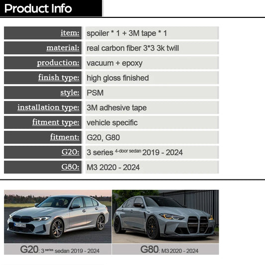 3*3 3K Carbon Fiber Rear Trunk Spoiler for BMW 3 Series G20 Sedan 4-Door 2019 - 2024 320d 330i 335d M340i & G80 M3 2020 - 2024