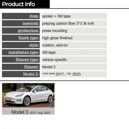 3*3 3K Dry Carbon Press-molding Prepreg Carbon Fiber Rear Lid Spoiler for Tesla 2017 - Aug. 2023 Model 3 (Not for 2023 Refresh)