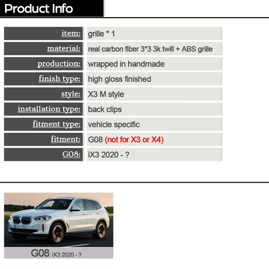 3*3 3K High Gloss Carbon Fiber Replacemnt Front Bumper Kidney Grille Hood Grill X3M 2-Slat Type for BMW iX3 G08 2020+ (iX3 Only)