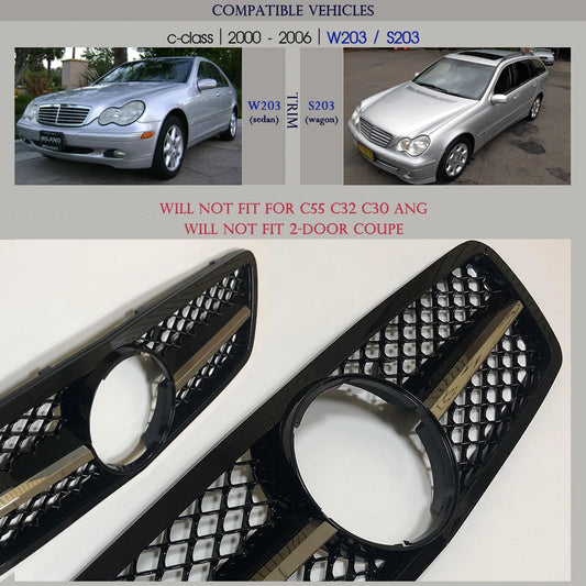Front Bumper Grille for Mercedes C Class W203 S203 2000 - 2006, Will Not Fit For C32 C63 ANG