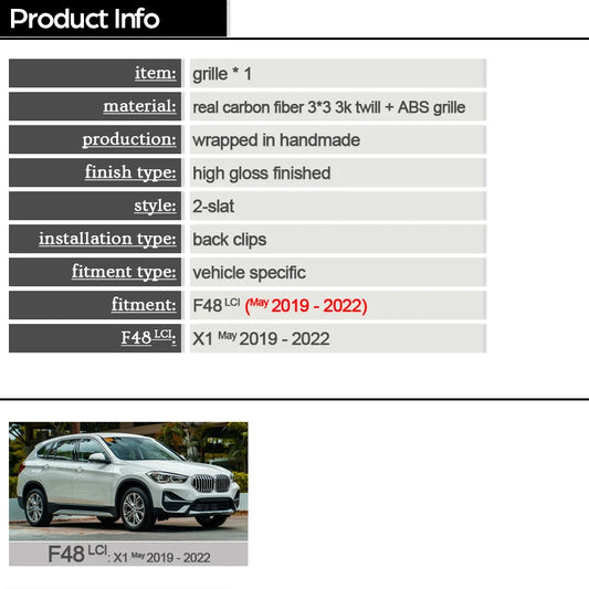 3*3 3K Carbon Fiber Front Bumper Kidney Grille for BMW X1 F48 LCI 2019 - 2022 sDrive18i sDrive20i sDrive16d sDrive18d sDrive20d