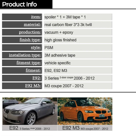 Carbon Fiber Rear Trunk Spoiler Boot Wing for BMW 2006 - 2012 3 Series 2-Door Coupe E92 318i 320i 320d 323i 325i 330i 330d M3